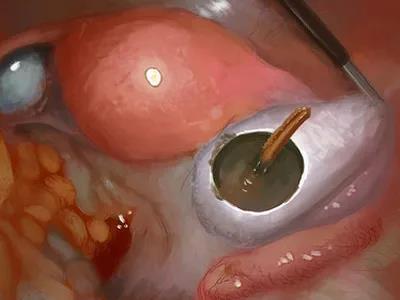 在剔除卵巢囊肿中囊壁破裂,流出暗红巧克力色积液,术中诊断:巧克力囊肿