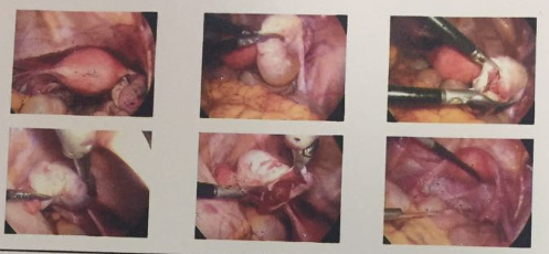 术中诊断:1、左侧卵巢妊娠流产;2、右侧卵巢囊肿;3、右侧输卵管系膜囊肿,同患者家属讲明情况,要求同时行右侧卵巢及右侧输卵管系膜囊肿剥除术,遂进行左侧卵巢妊娠清除术及右侧卵巢囊肿、右侧输卵管系膜囊肿剥除术。
